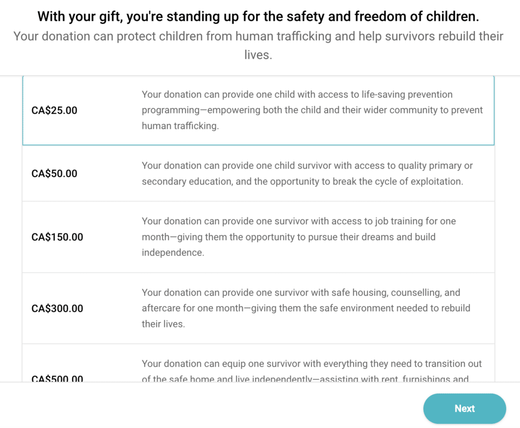Gen Z’s are moved to give when they know how their dollar is being used. Consider including donation tiers on your donation form to effectively demonstrate how their donation will make an impact and where their money is going.
