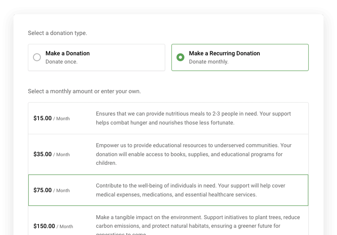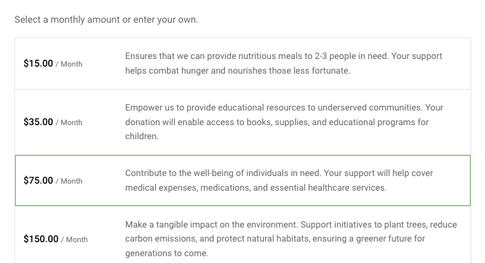 Give donors the ability to quickly select a suggested donation amount or see how their contribution makes an impact.